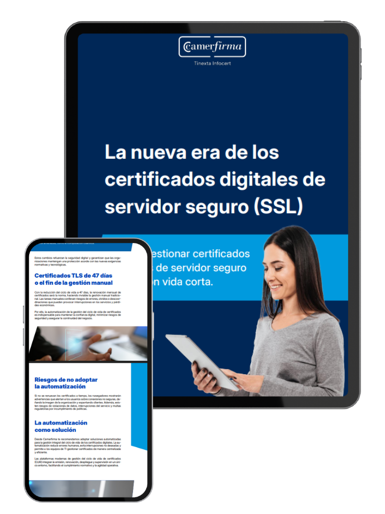 Descarga esta guía de Camerfirma y descubre el plan de acción detallado para evitar estos riesgos. Te explicaremos los orígenes de este cambio impulsado por el CA/Browser Forum, por qué es tu mejor defensa activa contra las nuevas amenazas y, lo más importante, cómo el modelo de "Certificado como Servicio" (CCS) te permite delegar esta complejidad, asegurando que tu infraestructura se adapte sin interrupciones y con total eficiencia.